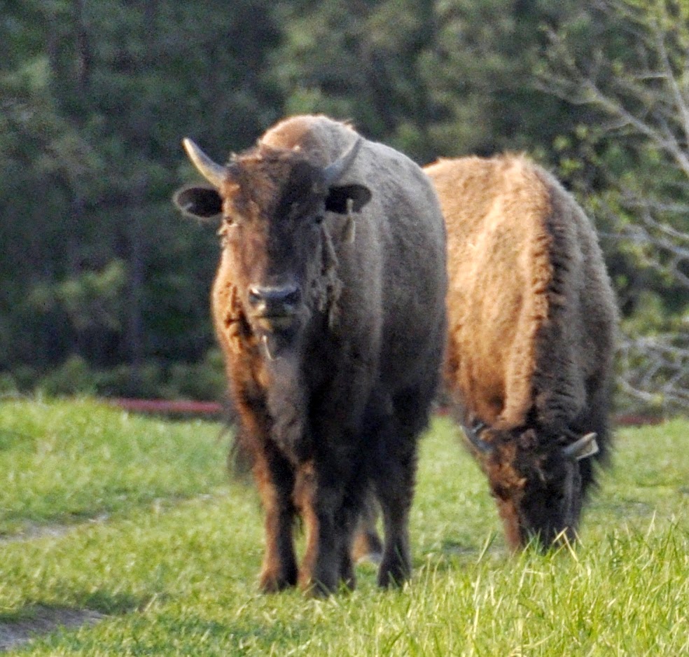 | One of the bison (closest to the photographer) in the process of molting her winter hair. |